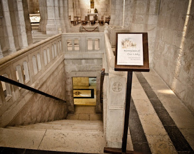 Sob as paredes da Basílica, estão as ruínas das fundações do antigo Santuário, certamente uma Basílica Bizantina, e uma cripta que era um dos cômodos da casa onde nasceu e viveu seus primeiros anos a Mãe de Deus e nossa Mãe.